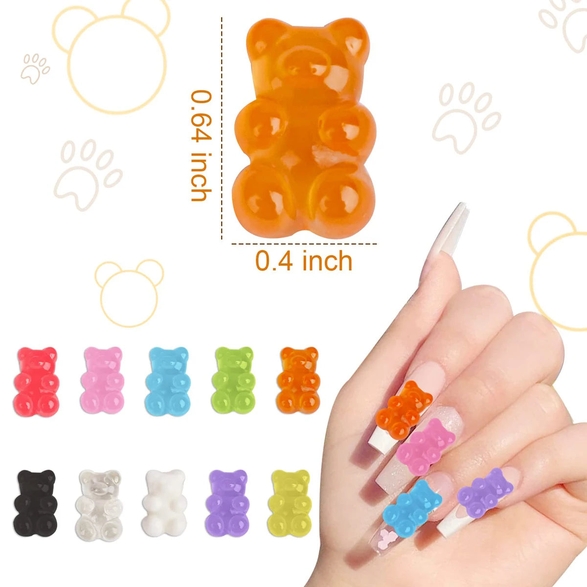 Includes 50 pieces of mixed candy-colored Gummy Bear charmsEach charm measures approximately 12x17mm – ideal for a standout nail look3D design with intricate detailing and shimmering rhinestonesEasy to apply on natural or artificial nails for a fun and stylish manicurePerfect gift for nail art enthusiasts, fashion-forward friends, or anyone who loves cute accessoriesGreat for DIY nail art projects, professional salons, or personal collections
